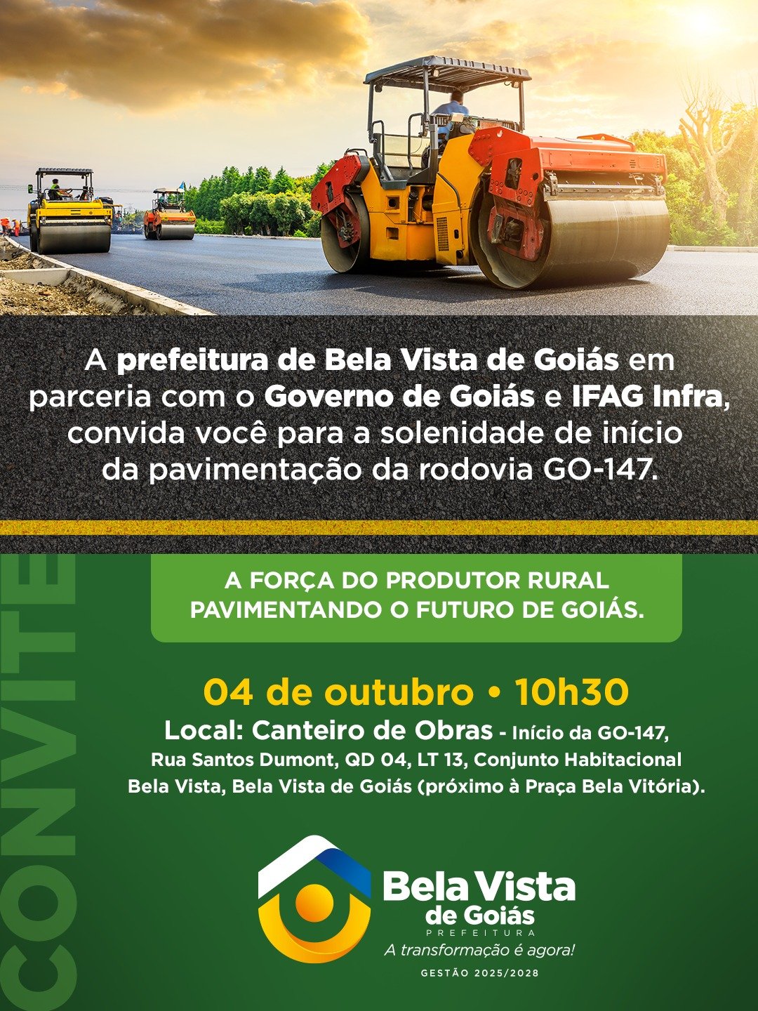 Obra será realizada em parceria com Governo de Goiás e IFAG Infra A Prefeitura de Bela Vista de Goiás, em