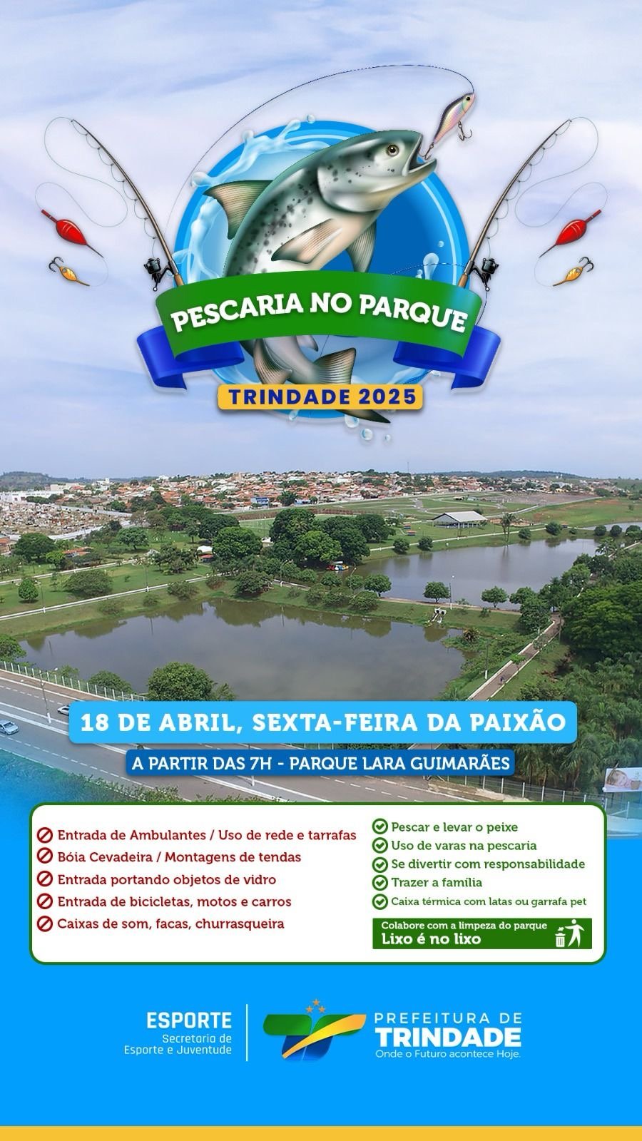 Uma tonelada de peixes já foi solta no lago do Parque Lara Guimarães; expectativa é reunir cerca de 2.500 pessoas