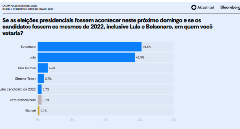 A 3ª pesquisa Latam Pulse, realizada pelo instituto Atlas Intel, revelou que o ex-presidente Jair Bolsonaro lidera a corrida para o Palácio do Planalto, superando o atual presidente Lula. Os dados foram divulgados nesta 6ª feira (7).