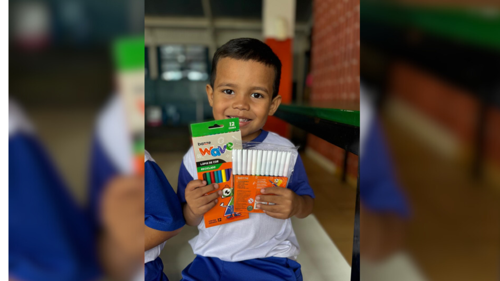 As crianças da Educação Infantil receberão kit de material diferente do Ensino Fundamental (1° e 2° ano). Os kits são compostos por: