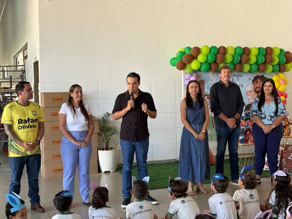 “Gente, olha que alegria! Eu tô aqui na Escola Aliança, no Distrito Garavelo Sul, onde nós temos quase 900 alunos. É uma alegria poder trazer a felicidade dessas crianças, mostrar o quanto a nossa administração é preocupada com as obras, com os benefícios, mas também valorizando as nossas crianças e as nossas famílias, neste dia tão especial que é a Páscoa, a ressurreição em Cristo. A gente prega isso aqui para eles e mostra a importância de uma gestão unida, parceira, e ver a alegria de todas essas crianças. É assim, trabalhando por uma Hidrolândia cada vez melhor.”