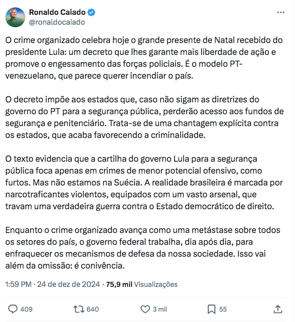“O crime organizado comemora hoje o grande presente de Natal que ganhou do presidente Lula: um decreto que lhes garante mais liberdade para agir e engessa as forças policiais. É um modelo de gestão inspirado no PT e em regimes como o venezuelano, que só aumenta a instabilidade no país”, disse o Governador de Goiás, em suas redes sociais.